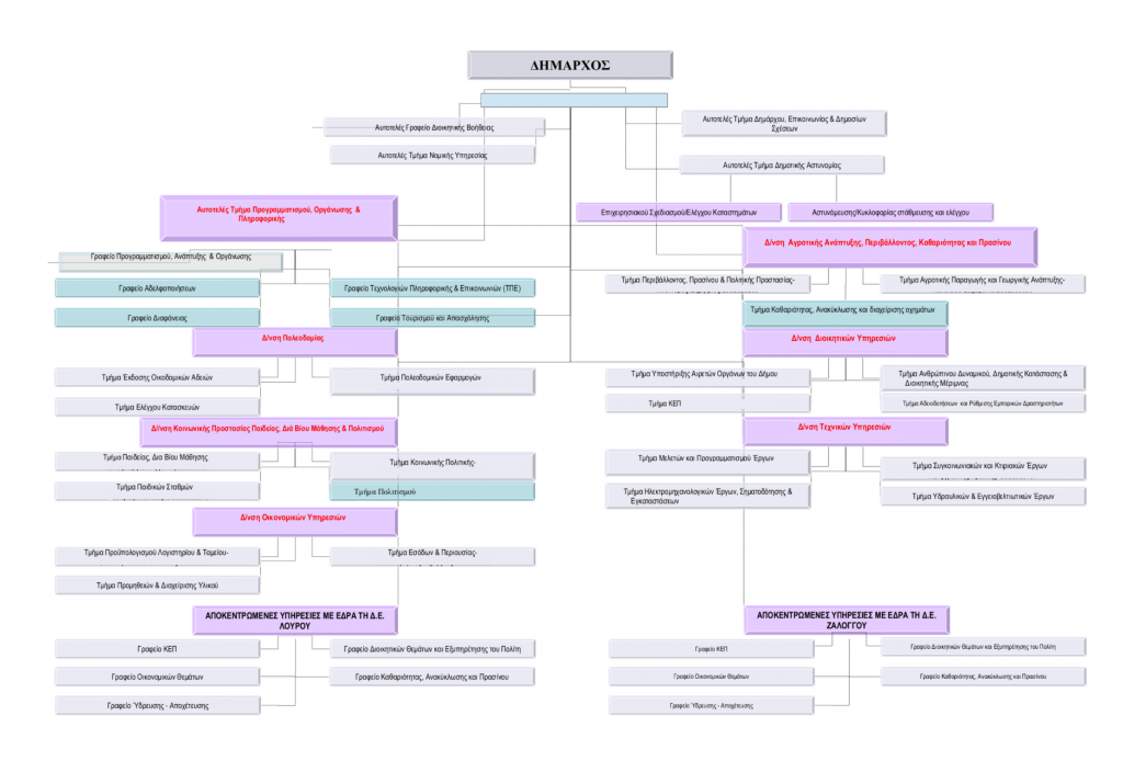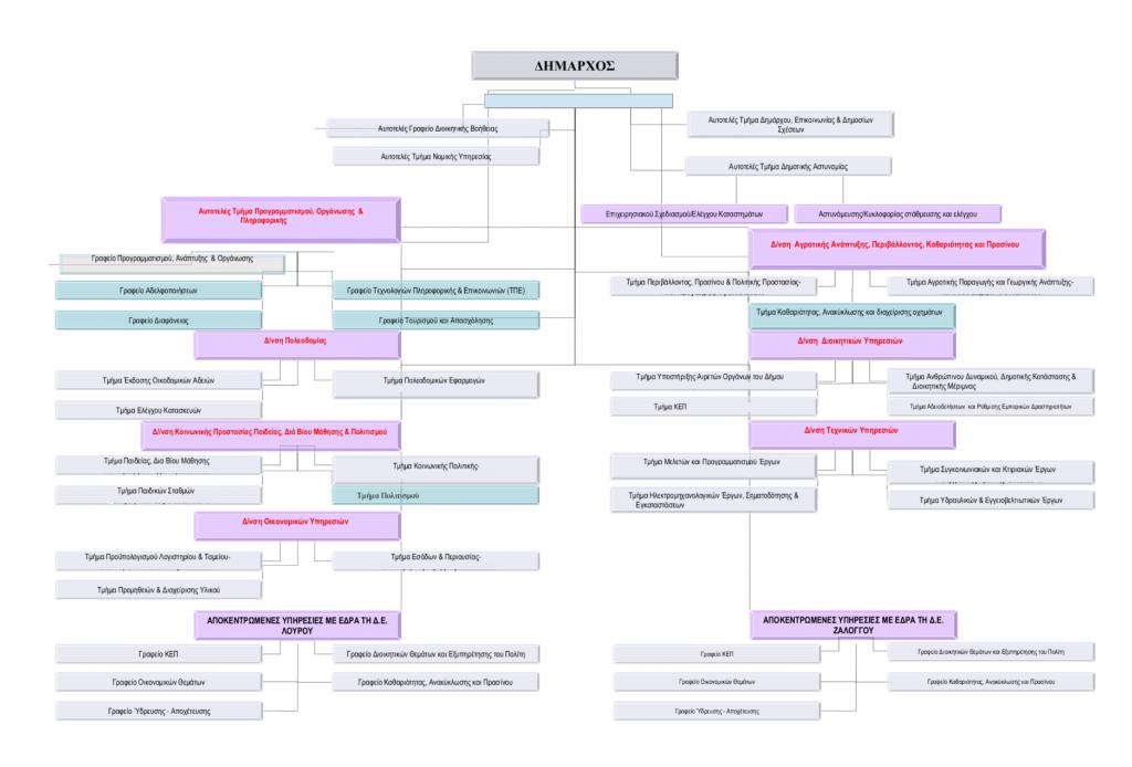 Στην παρακάτω εικόνα μπορείτε να δείτε το οργανόγραμμα του Δήμου. Κάντε κλικ στην εικόνα για να την δείτε σε πλήρη ανάλυση.