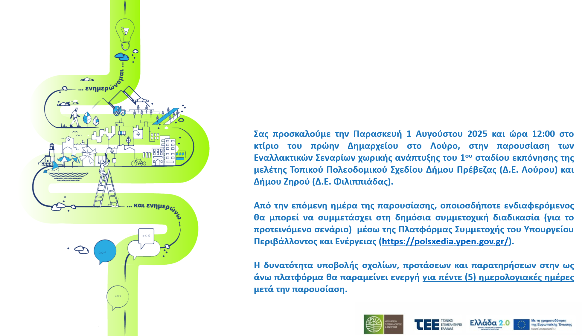 Σας προσκαλούμε την Παρασκευή 1 Αυγούστου 2025 και ώρα 12:00 στο κτίριο του πρώην Δημαρχείου στο Λούρο, στην παρουσίαση των Εναλλακτικών Σεναρίων χωρικής ανάπτυξης του 1ου σταδίου εκπόνησης της μελέτης Τοπικού Πολεοδομικού Σχεδίου Δήμου Πρέβεζας (Δ.Ε. Λούρου) και Δήμου Ζηρού (Δ.Ε. Φιλιππιάδας).